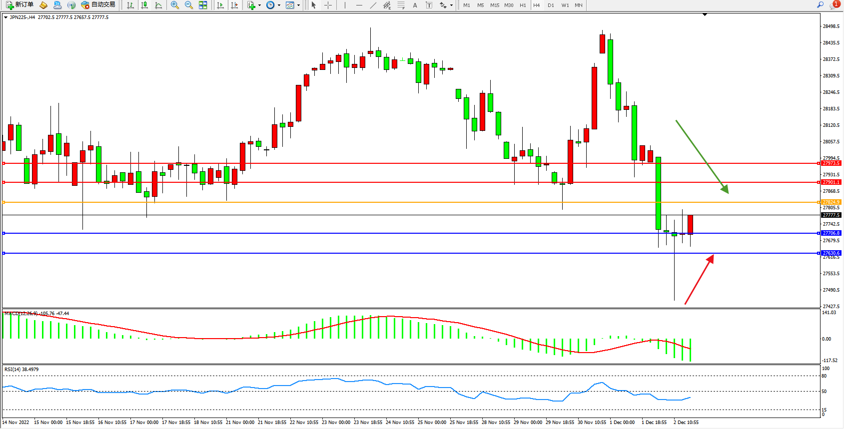 日经指数JPN225——4小时K线图显示: