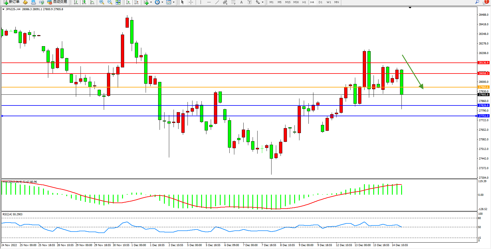 日经指数JPN225——4小时K线图显示: