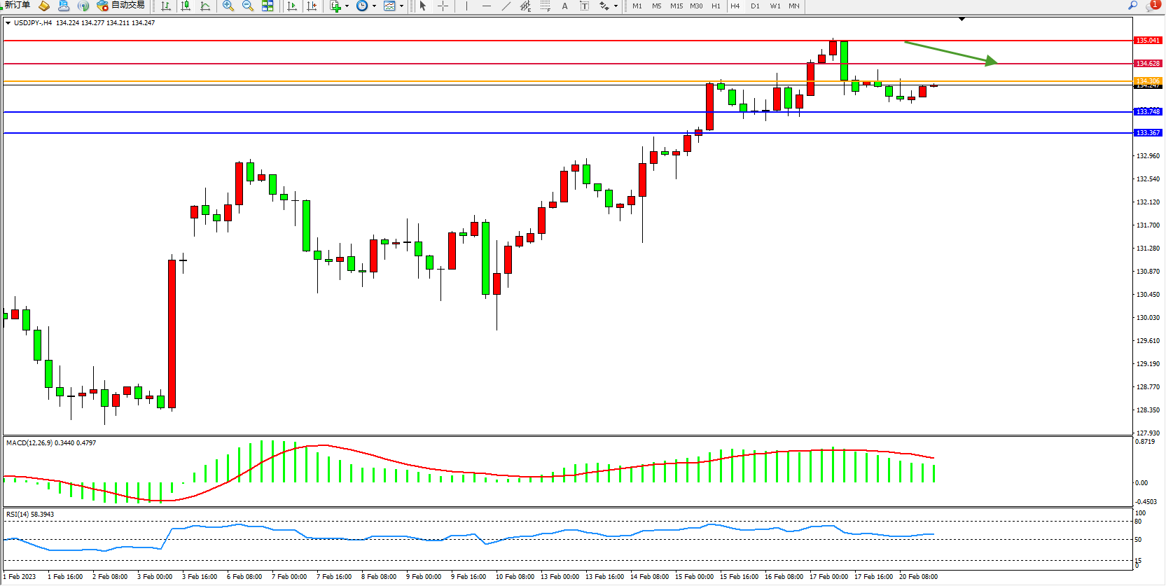 备选策略:134.306上方看涨,目标134.628、135.041