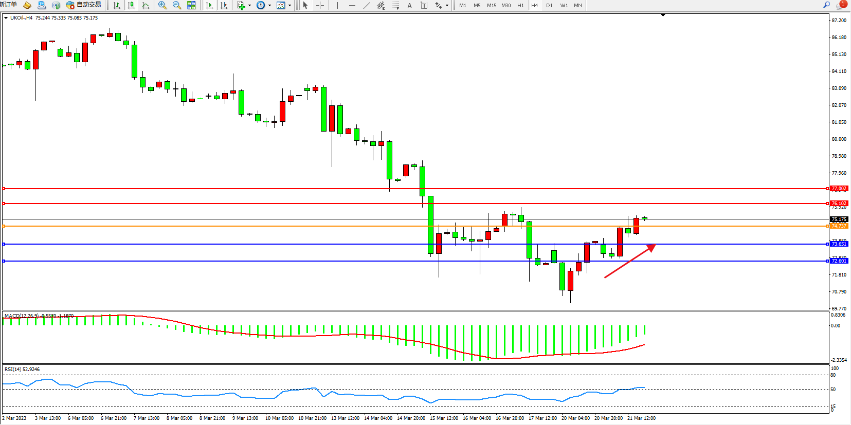 交易策略:74.737上方看涨,目标76.102 77.002