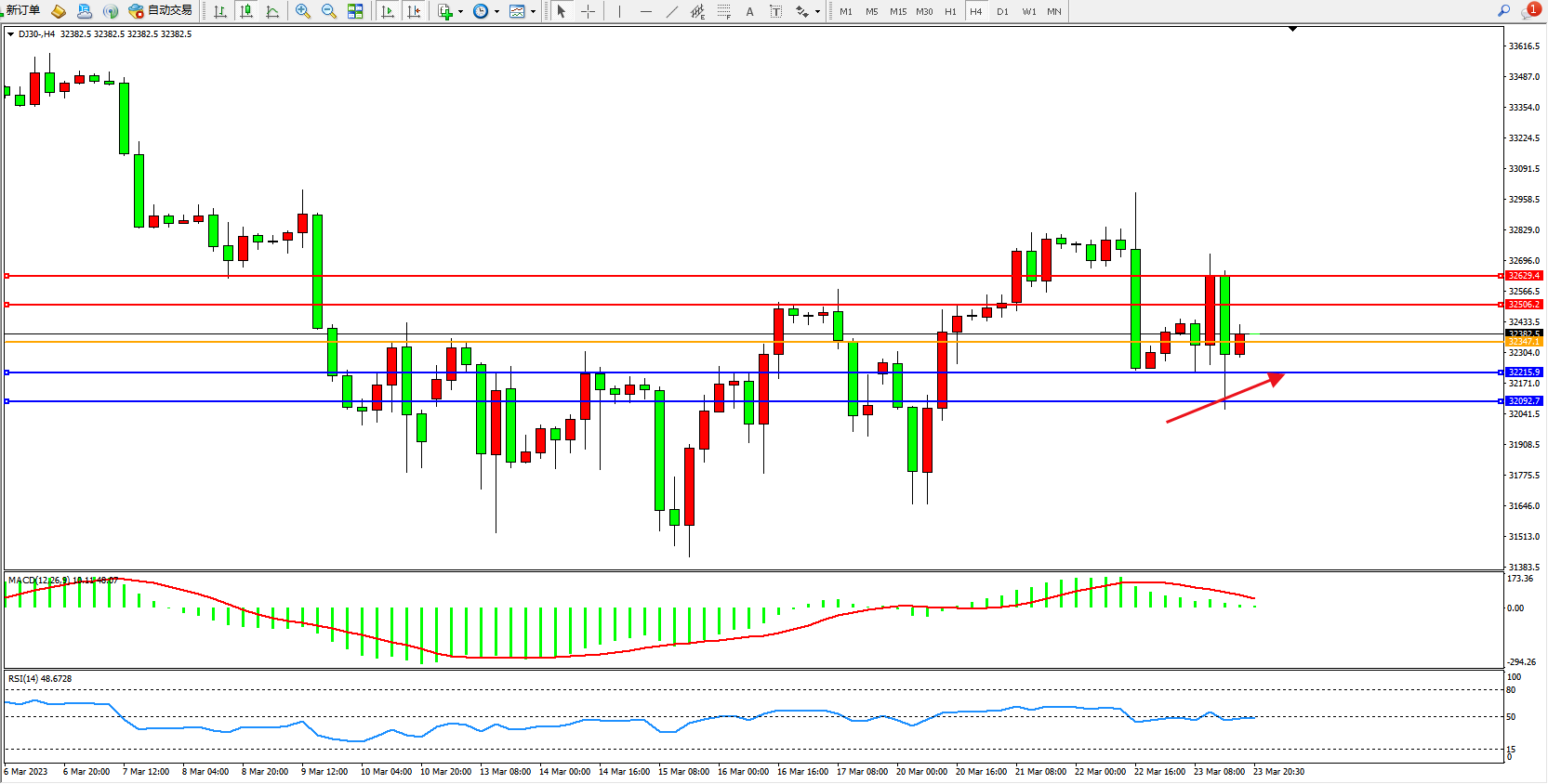 道琼斯指数DJ30——4小时K线图显示: