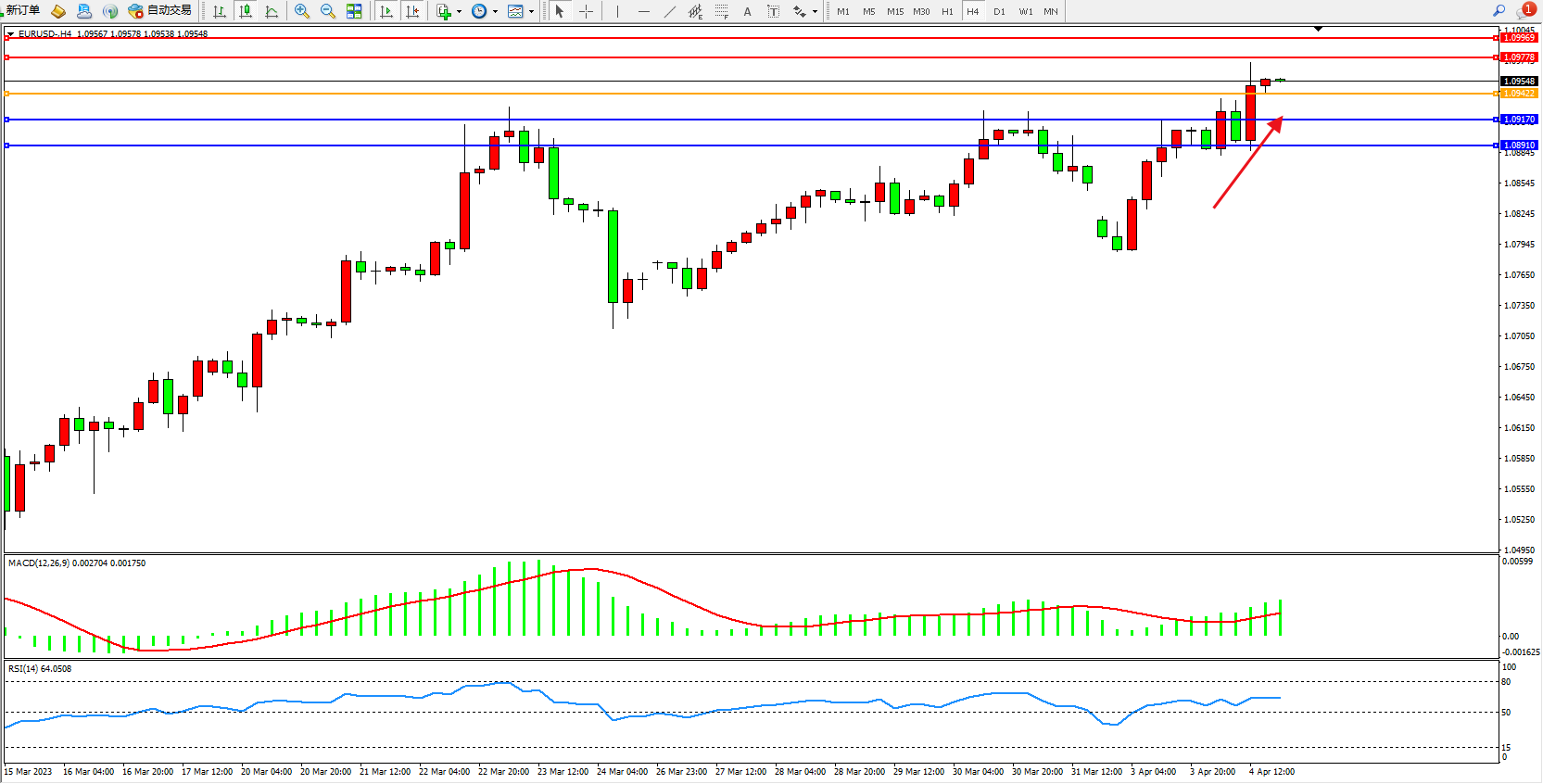 欧元美元EURUSD—4小时K线图显示: