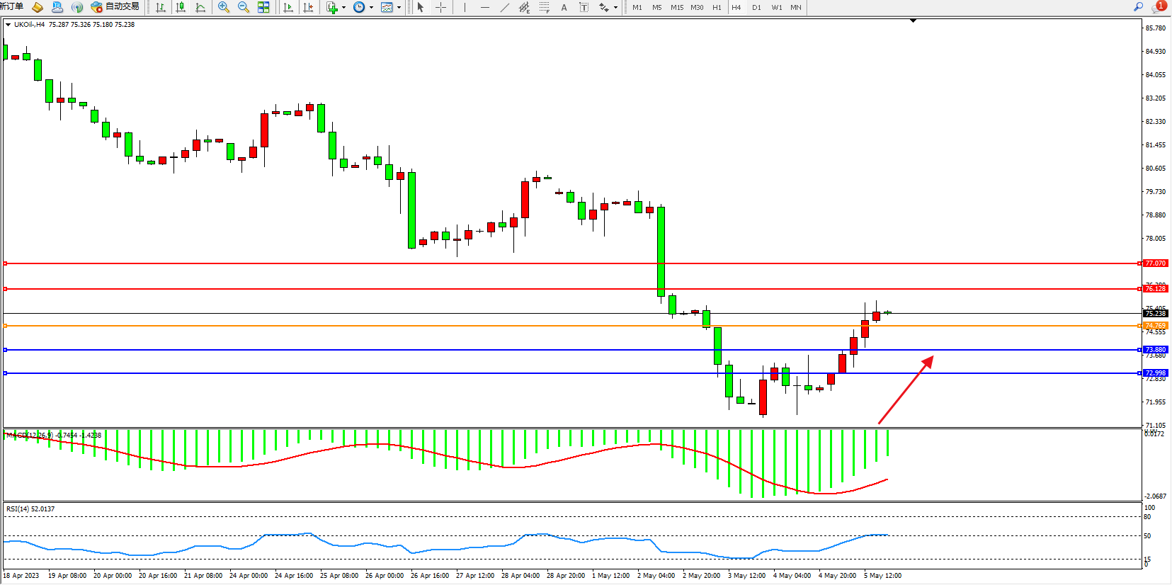 交易策略:74.769上方看涨,目标76.128 77.070