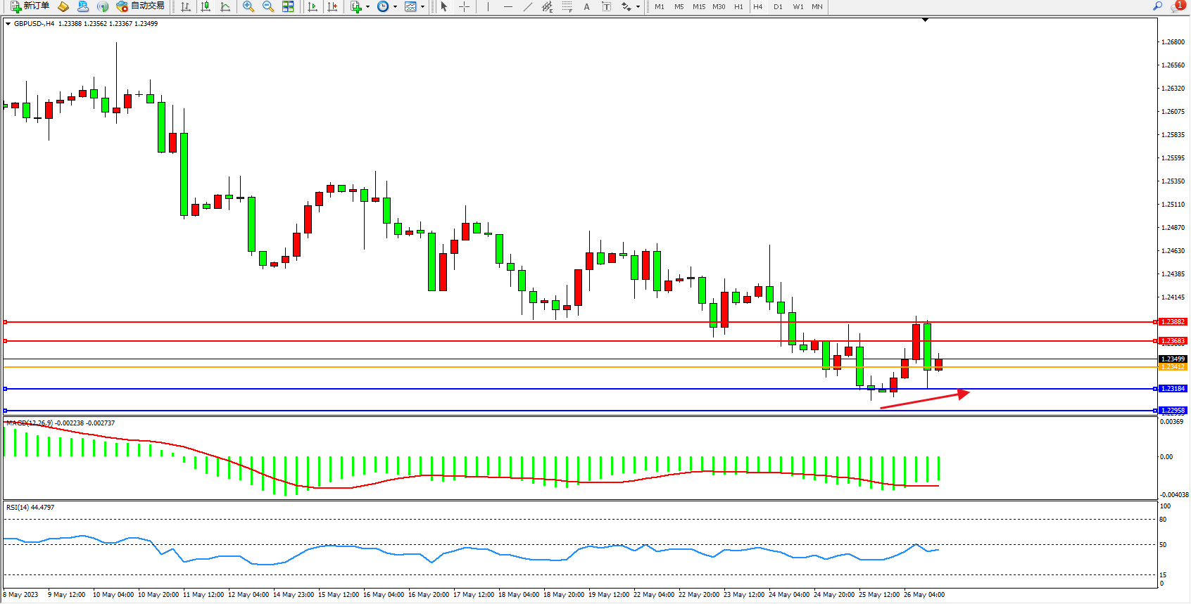 备选策略:1.23412下方看跌,目标1.23184  1.22958