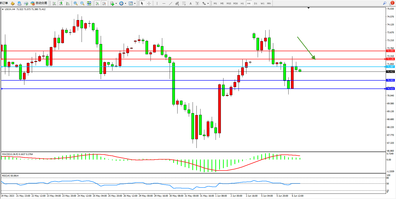 交易策略:71.687下方看跌,目标70.905 70.425
