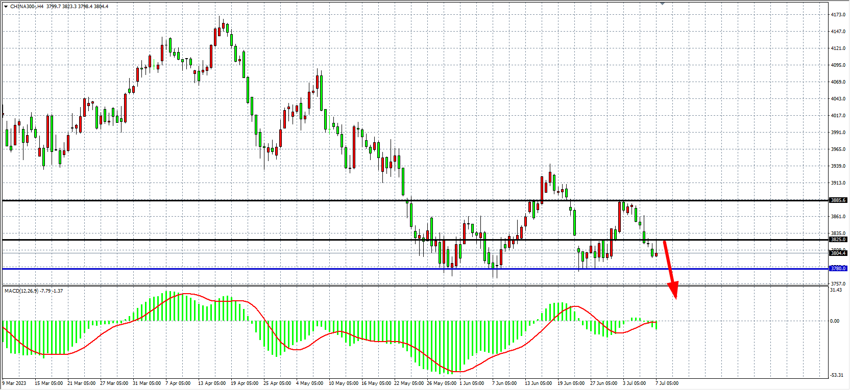 4小时图看,沪深300进一步回落至3800关口附近,MACD下穿零轴,趋势持续走弱,阻力下移至3825,下方支撑关注3780-3700附近。