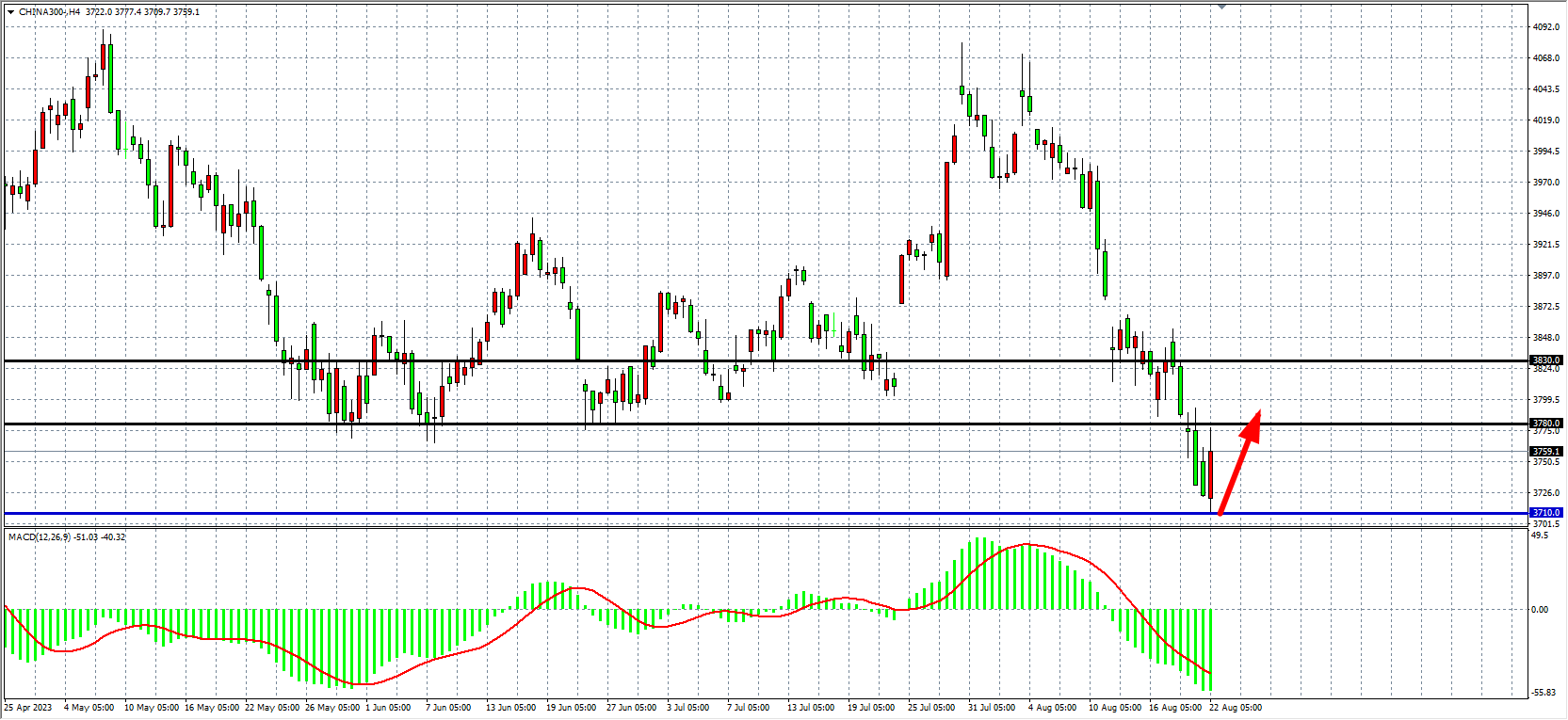 4小时图看,沪深300在3710再度获得支撑反弹,MACD量能仍在零轴下,反弹行情暂未能确立底部,下方支撑关注3710,上方压力3780-3830。