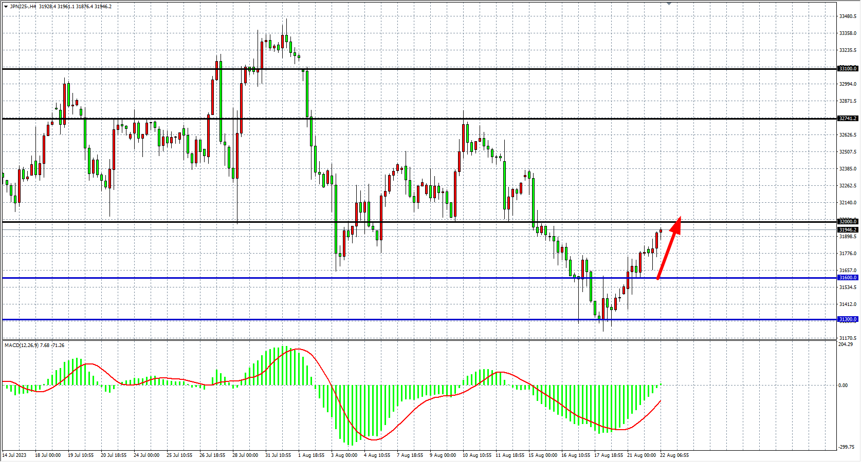 4小时图看,日经指数进一步上行至32000关口附近,MACD量能上穿零轴之上,短线走势偏强,阻力位关注32000附近。