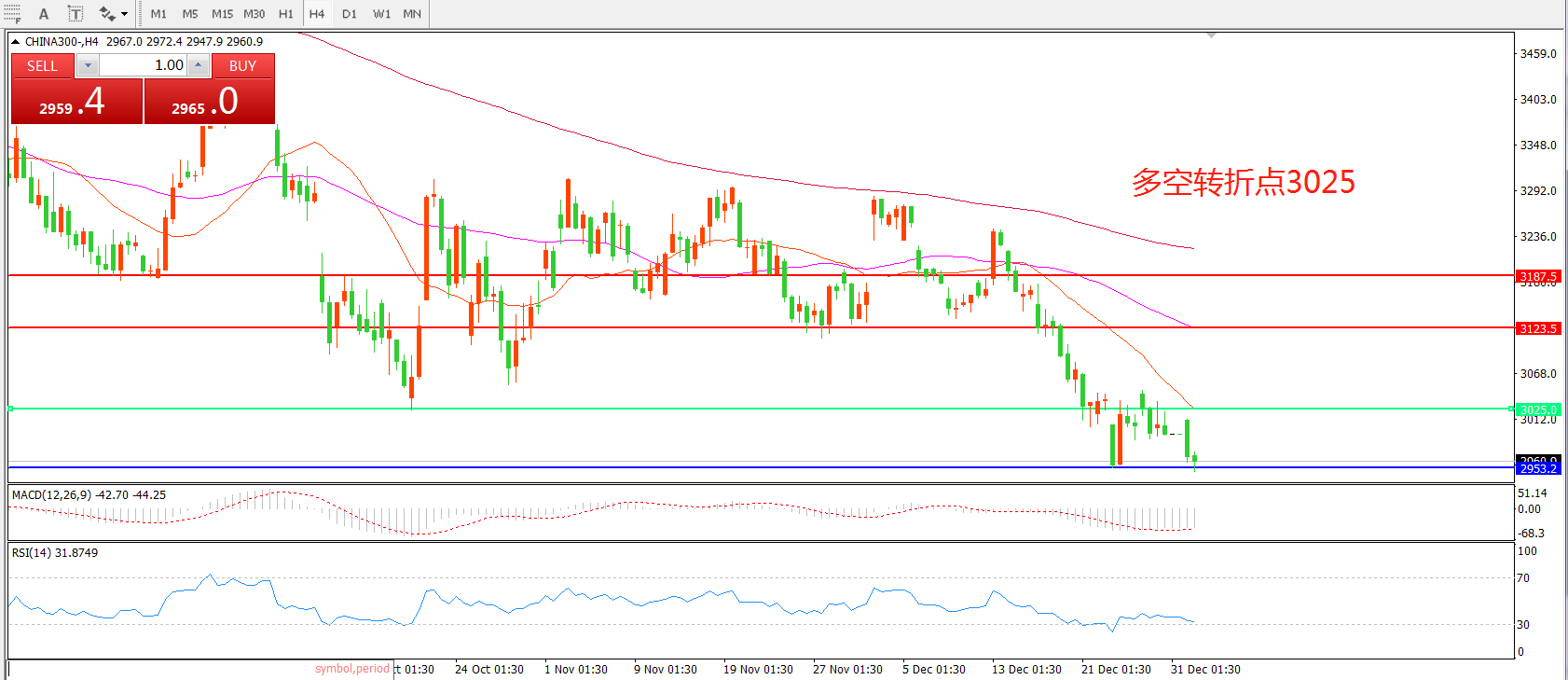 1小时图看,CHINA300中华指数跌破3000整数关口无力收复,支,均线系统呈空头排列, MACD绿柱增长,短线依然偏空