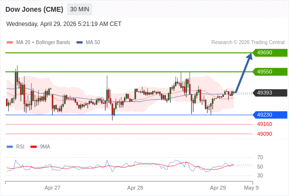 在 49230 之上,看涨,目标价位为 49550 ,然后为 49690 。