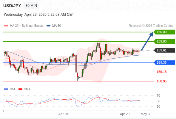 在 159.35 之上,看涨,目标价位为 159.80 ,然后为 160.00 。