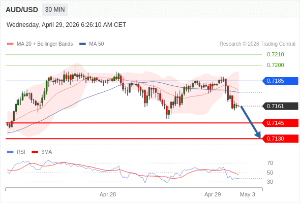 在 0.7185 之下,看跌,目标价位为 0.7145 ,然后为 0.7130 。