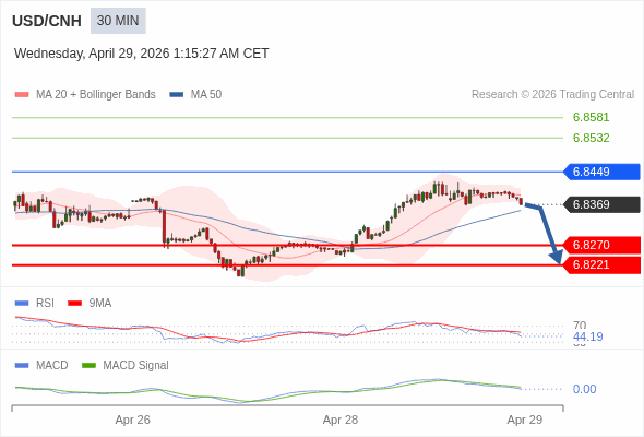 交易策略: 逐渐下跌,当 6.8449 阻碍上行,则 6.8221 为目标位。