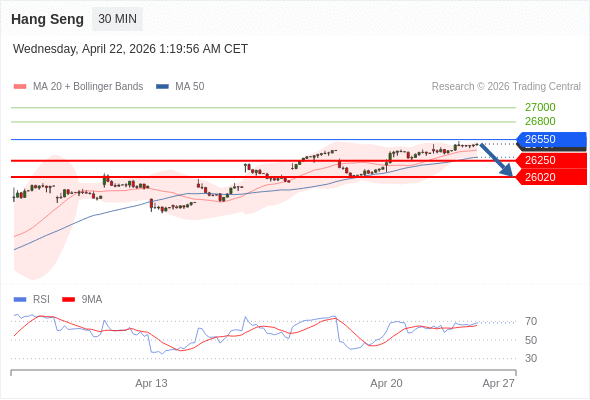 恒生指数 当日内: 短期关键阻力位在26550。