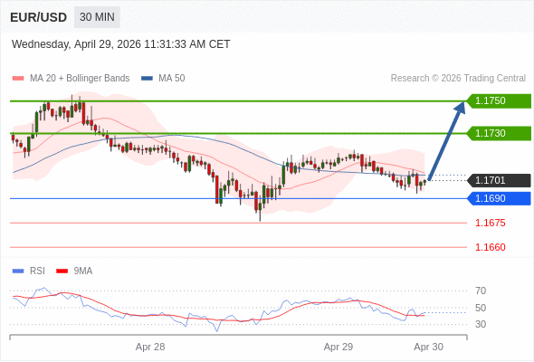 在 1.1690 之上,看涨,目标价位为 1.1730 ,然后为 1.1750 。