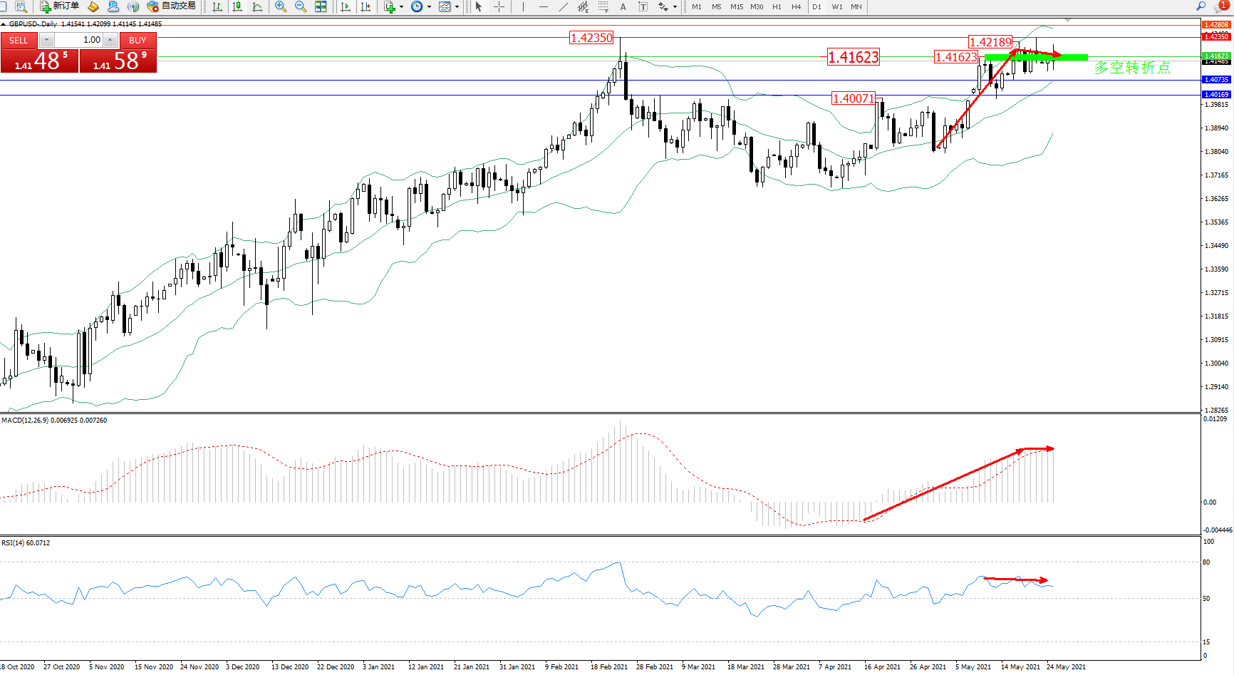 备选策略:1.41623上方看涨,目标1.42350、1.42808