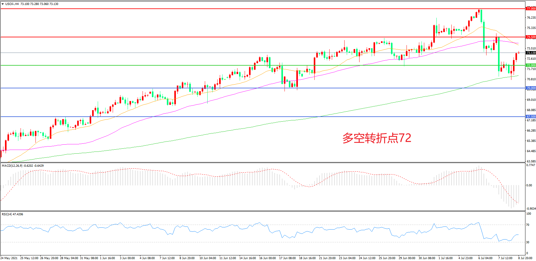 周四(7月8日),根据美国能源信息署公布的数据显示,当周EIA原油库存降幅超过预期,市场信心受到提振,美国WTI原油震荡反弹,收报73.20美元/桶。由于沙特和阿联酋罕见公开争吵导致谈判陷入僵局,油价一度快速回调,中期来看OPEC+的政策选择,仍是影响原油供需平衡表的重要因子,从短线看,美油震荡反弹的概率较大。