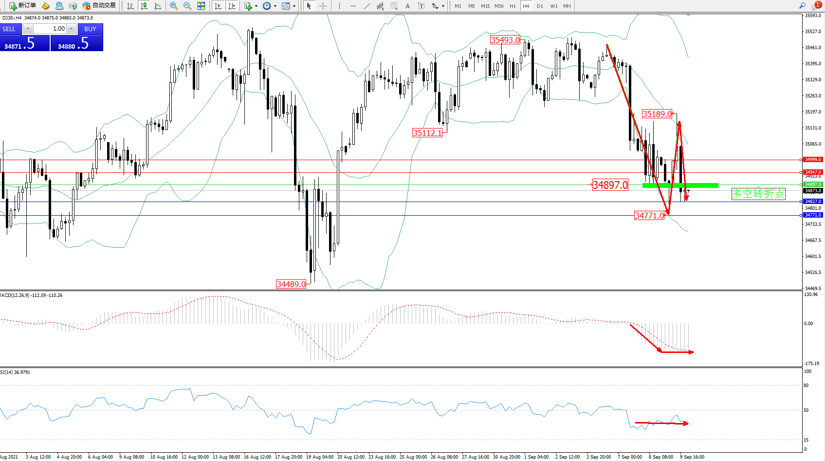 交易策略:34897下方看跌,目标34827、34771