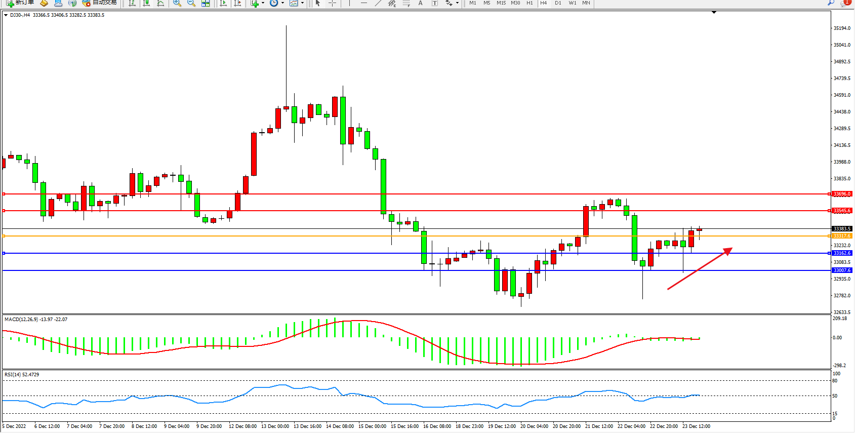 道琼斯指数DJ30——4小时K线图显示: