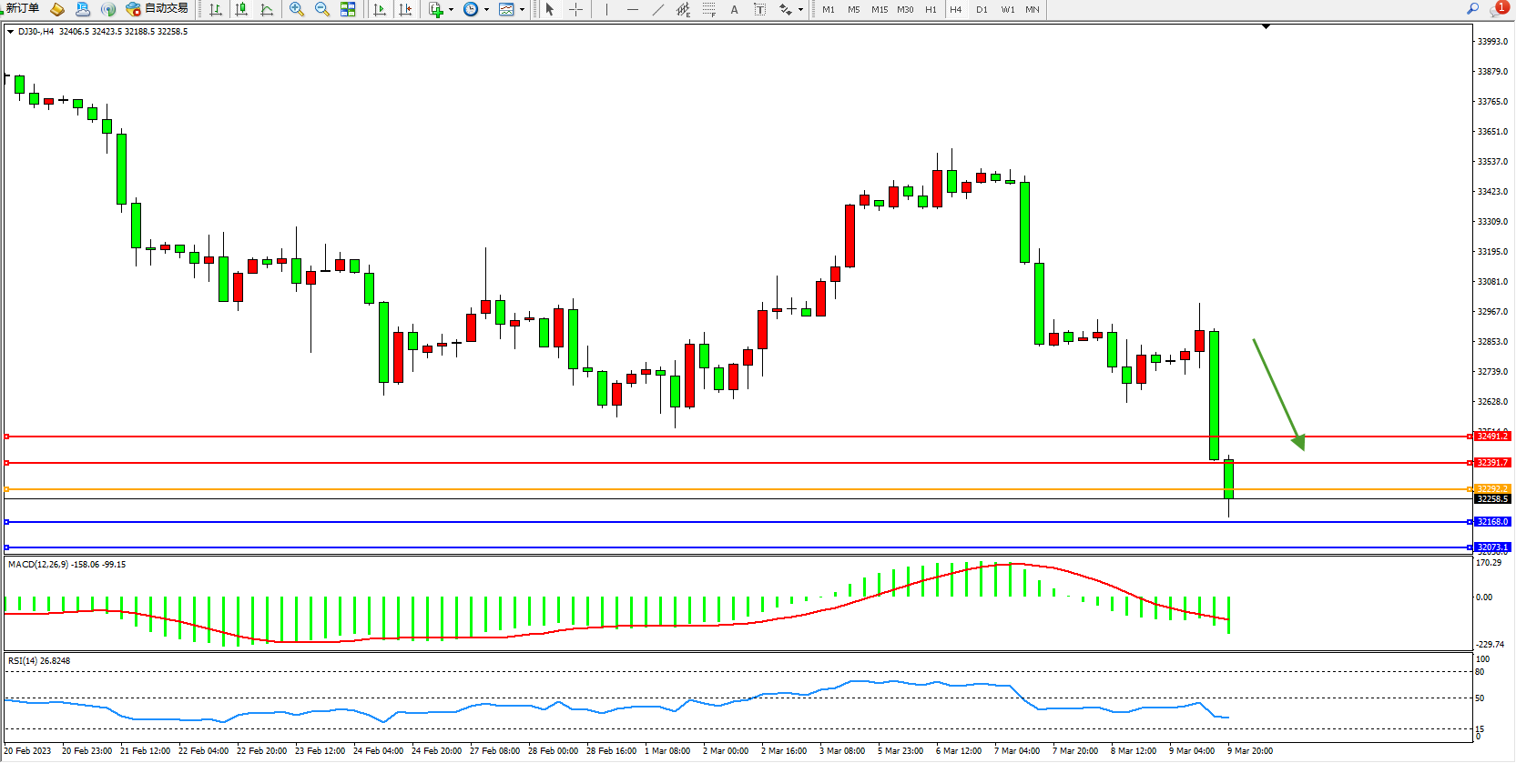 道琼斯指数DJ30——4小时K线图显示: