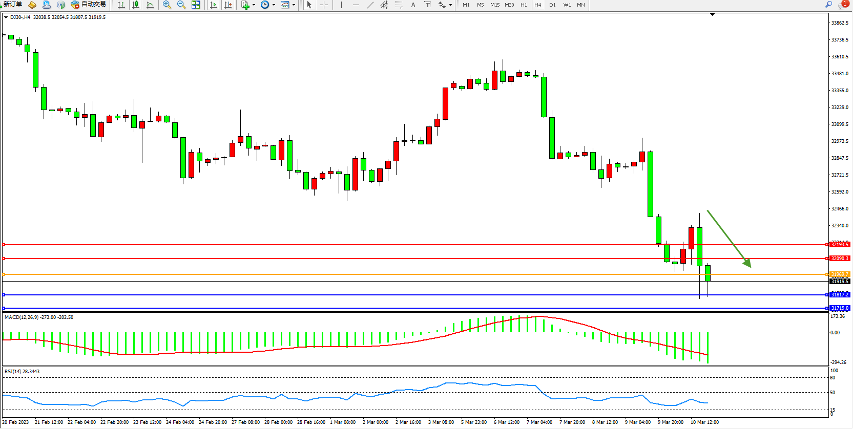 道琼斯指数DJ30——4小时K线图显示: