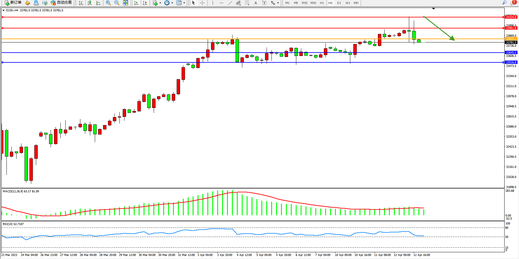 道琼斯指数DJ30——4小时K线图显示: