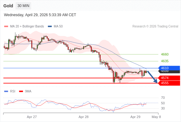 在 4610 之下,看跌,目标价位为 4574 ,然后为 4555 。